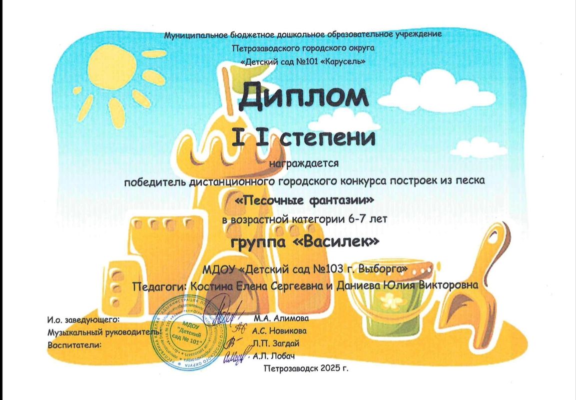 Подведены итоги творческого конкурса «Песочные фантазии»! 🏆 Мы с огромной радостью сообщаем, что коллективная работа наших воспитанников — «Выборгский замок на Замковом острове» — была удостоена II МЕСТА! 🥈